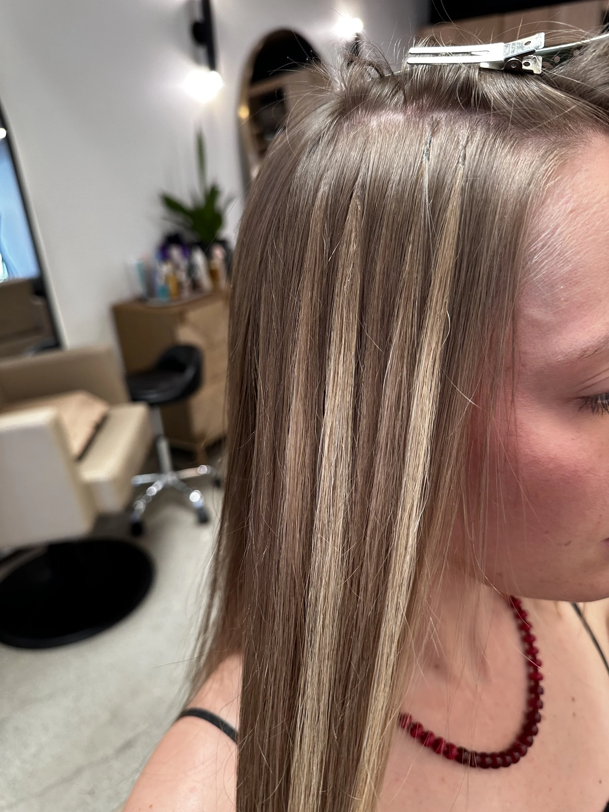 K-tip extensions are individual hair strands that are attached to your natural hair using a heat-activated keratin adhesive. They provide a long-lasting results that can last up to 3–4 months with proper care. K-tips are ideal for clients who want no upkeep and seeking density and strategic filling in finer areas.
